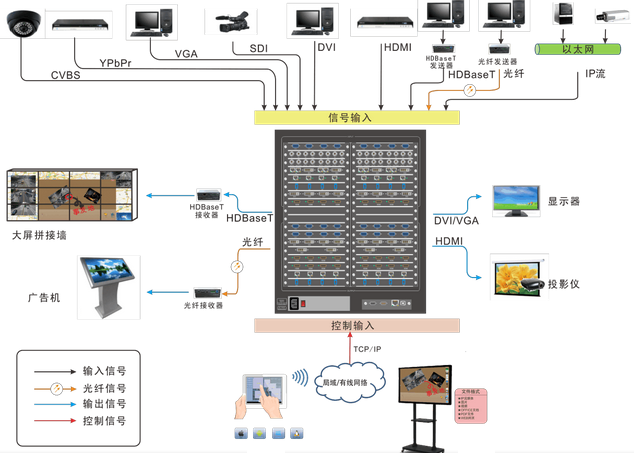 支持所有常用輸入/輸出信號(hào)卡,與HDMI,HDbaseT,SD/HD/3G-SDI,光纖,DVI和VGA(兼容YUV,YC及CVBS)可以任意輸入切換到任意輸出;