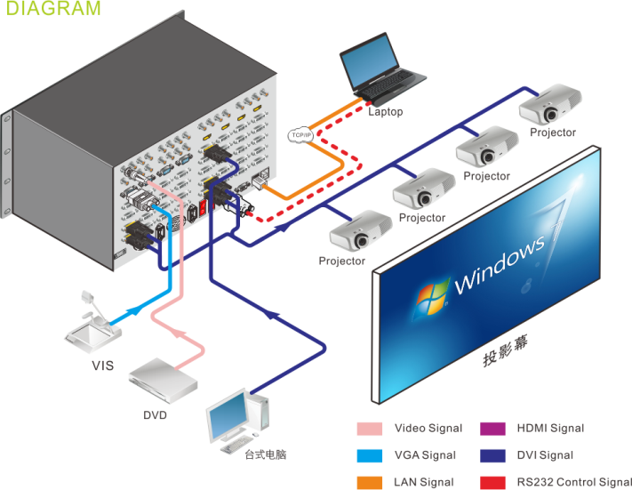 8、控制方式:TCP/IP網絡控制,RS232控制,USB方口控制,紅外,按鍵,STC和MTC(平板電腦控制)等控制方式