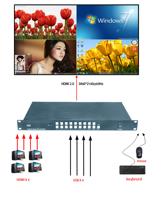 3、支持KVM切換功能,通過鍵盤熱鍵切換畫面顯示模式、音頻切換、四分割鼠標(biāo)穿越功能;